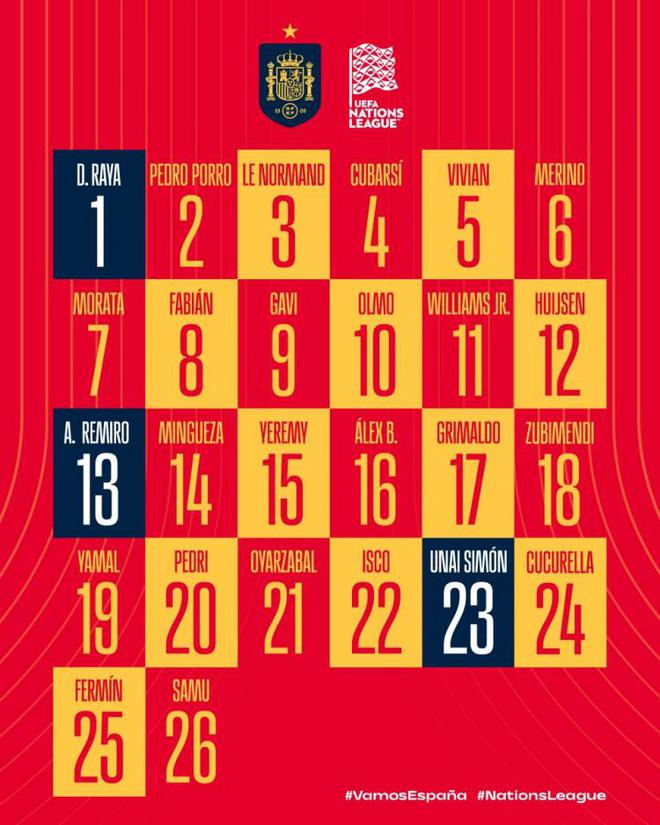 西班牙公布本期国家队球员号码(欧国联比赛号码)。